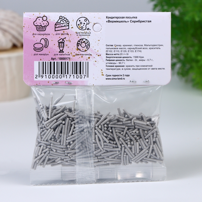 Кондитерская посыпка "Вермишель", серебристая, 20 г