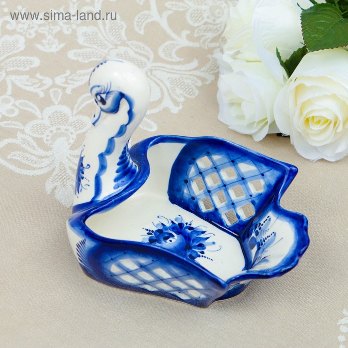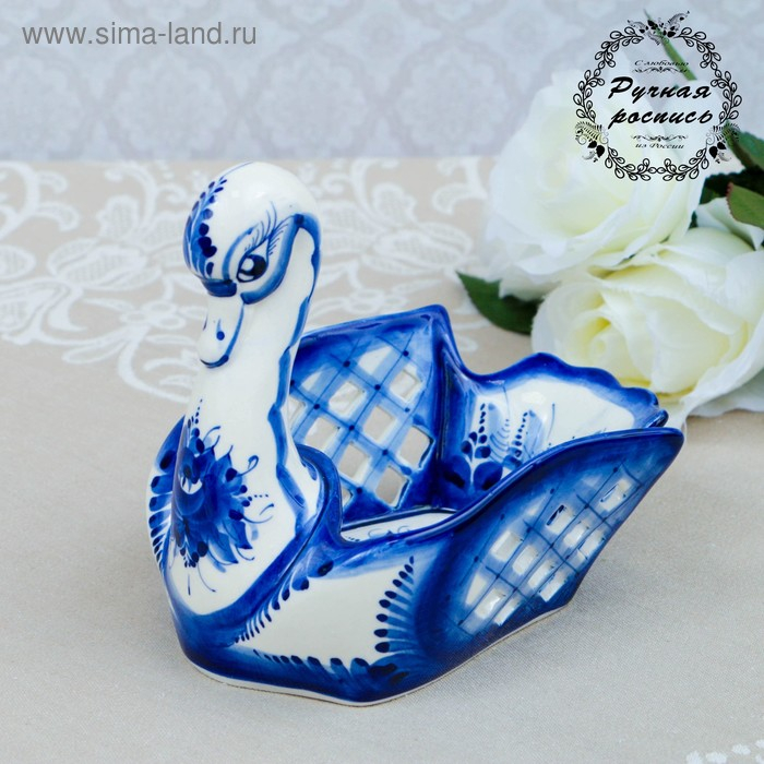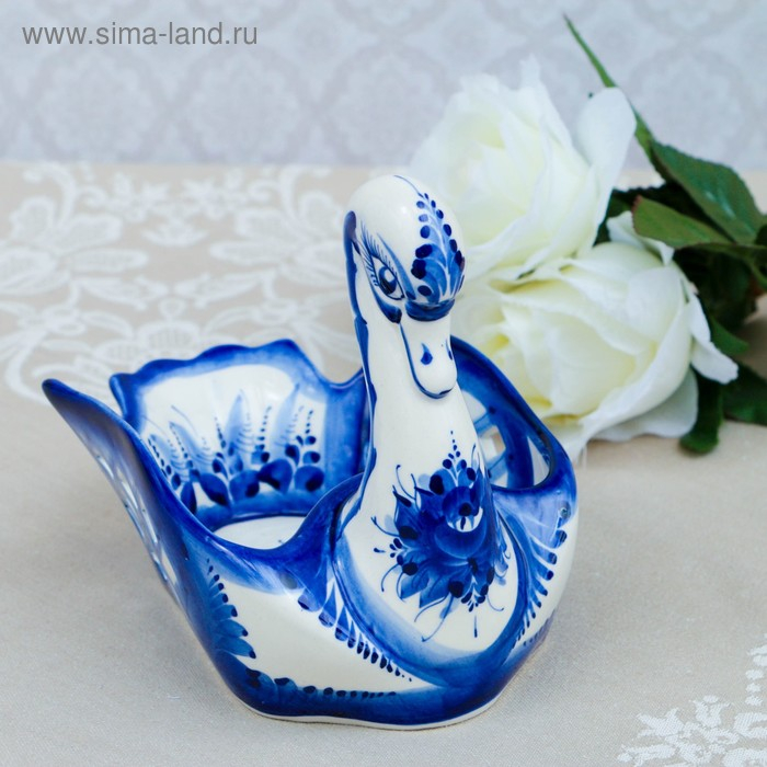 Конфетница "Лебедь", гжель, фарфор, резная, 14х15 см