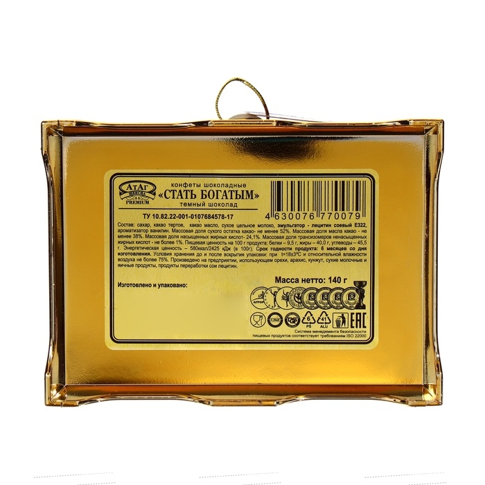 Конфеты шоколадные "Стать богатым" — это изысканное угощение, которое перенесёт вас в атмосферу настоящей царской роскоши. Упаковка в виде золотого сундука привлекает внимание и создает ощущение, будто внутри скрываются самые ценные сокровища. Каждая деталь упаковки продумана до мелочей, что делает этот продукт не только вкусным угощением, но и истинным произведением искусства, идеально подходящим для подарка на любой торжественный случай или просто для того, чтобы порадовать себя и близких.