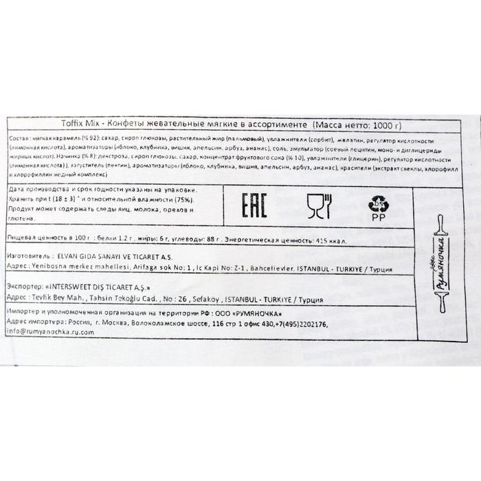 Конфеты жевательные Toffix с фруктовым наполнителем, 1000 г