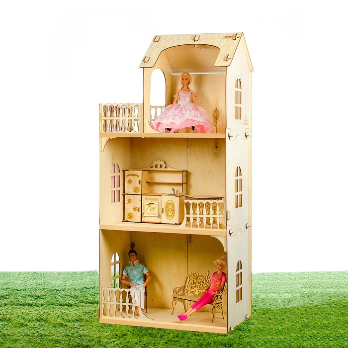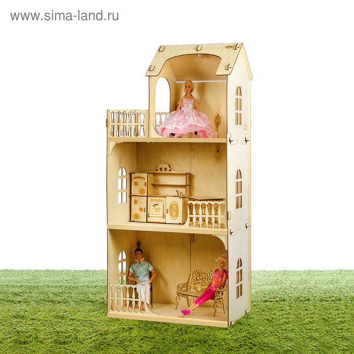 Трехэтажный кукольный с 3 большими комнатами и просторным балконом. В комплекте пошаговая инструкция в картинках. Детали собираются между собой просто, как конструктор, без клея. После сборки у вас получится удобный и просторный домик для кукол.