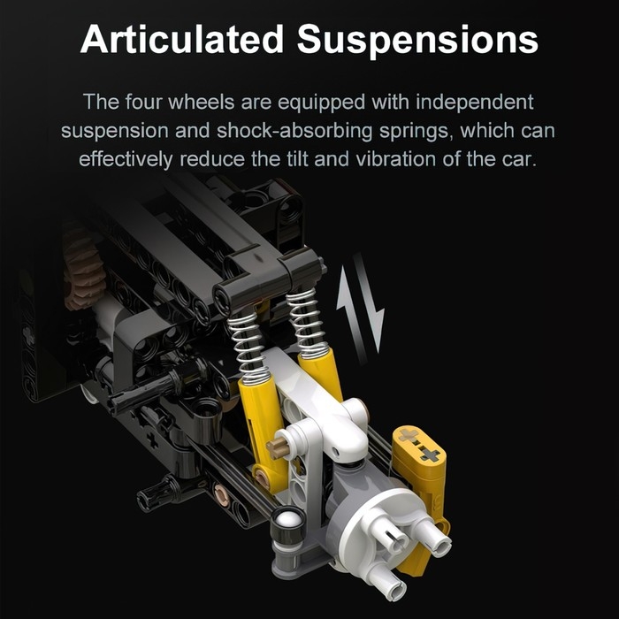 - Полноценная система амортизирующих и тормозных пружин на каждом колесе, снижающая вибрацию и крен модели.