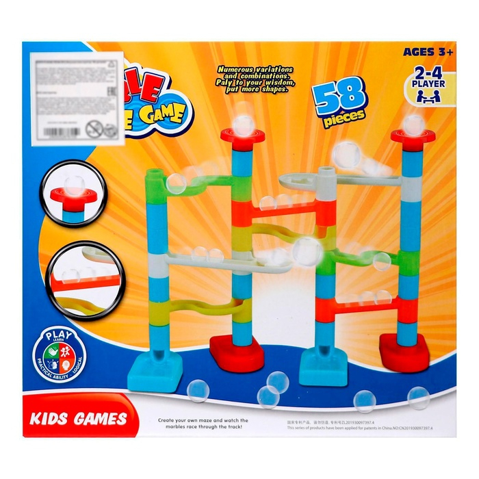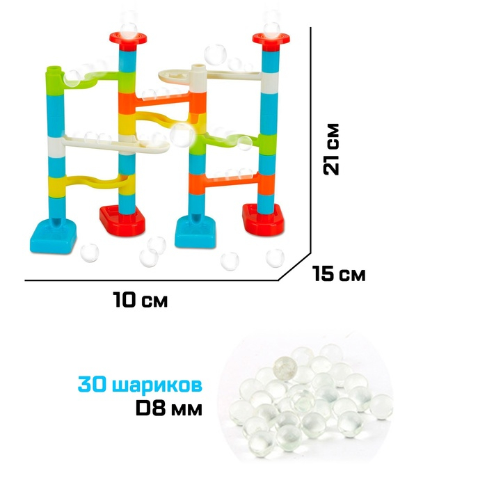 Части конструктора выполнены из качественных материалов, безопасных для здоровья ребёнка. Крохе не составит труда построить желаемый лабиринт: элементы легко скрепляются между собой. Чередуйте трубочки с пандусами, и у вас получится модуль для игры.