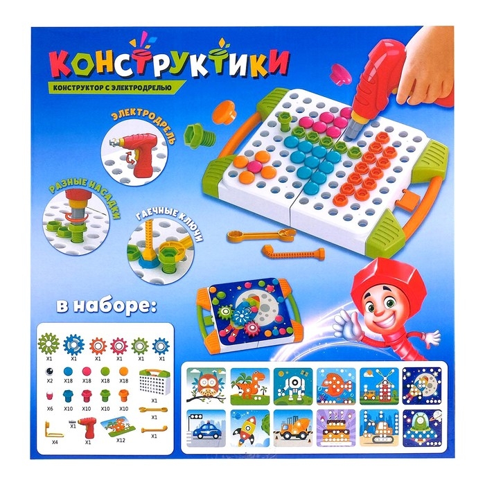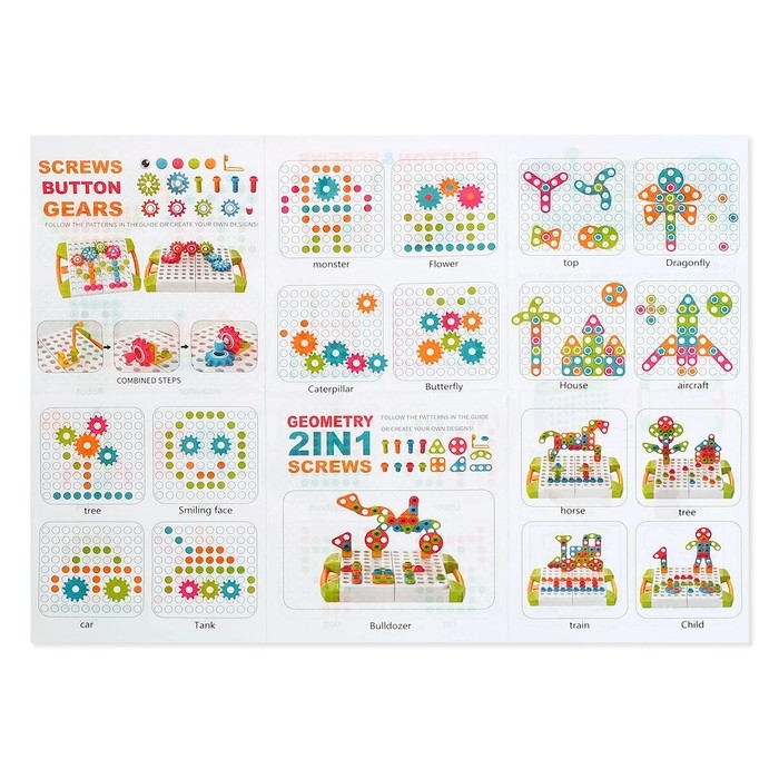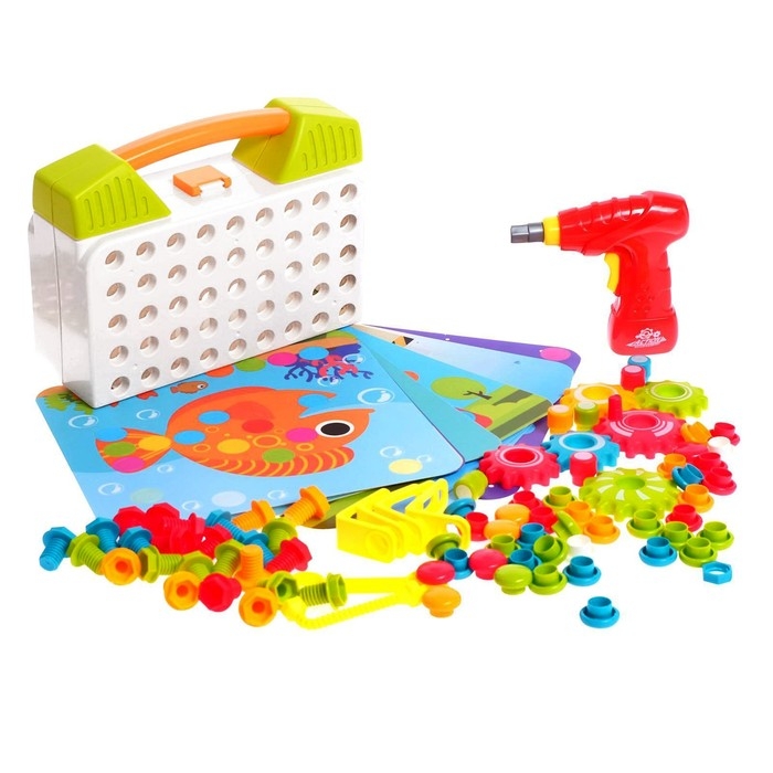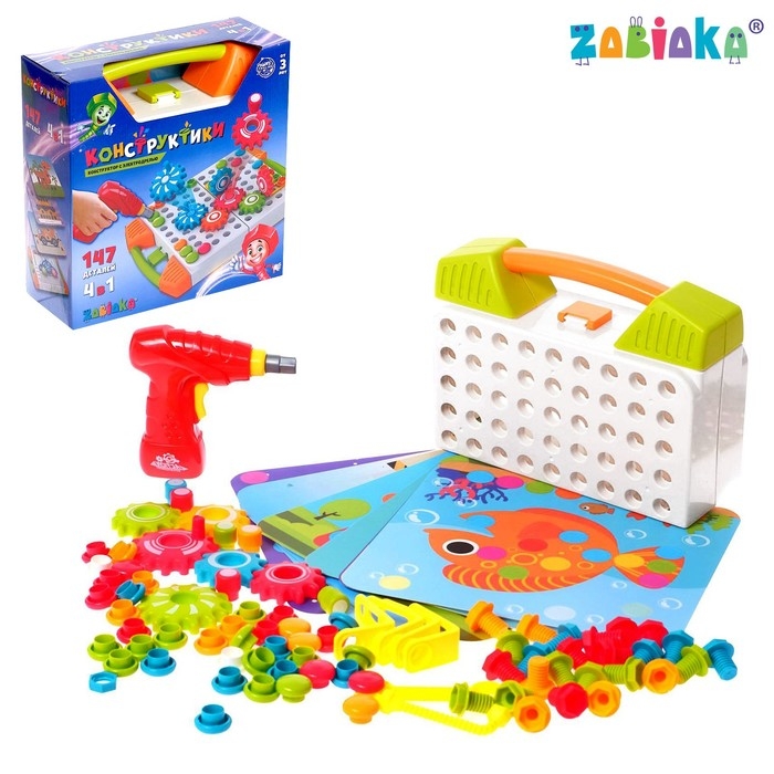 Конструктор винтовой «Пуговки и шестеренки», 3 в 1, с шуруповёртом, 147 деталей и 12 карточек
