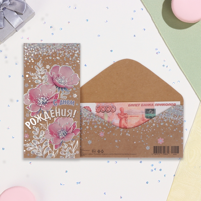 Конверт для денег "С Днём Рождения!" крафт, тиснение, розовые цветы, 17х8 см