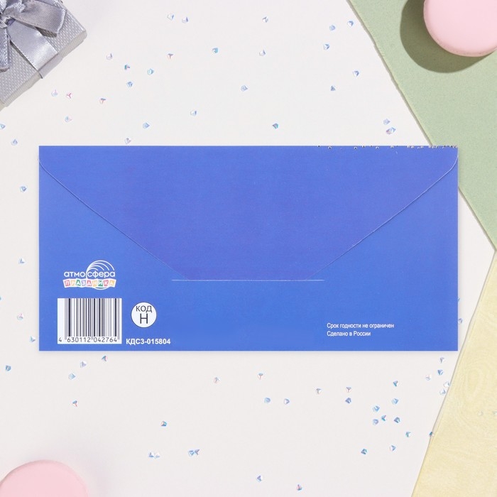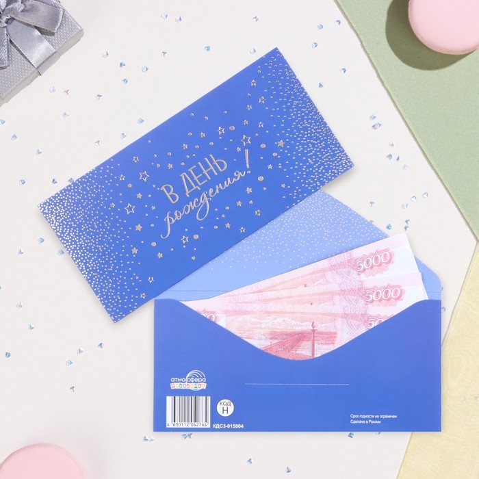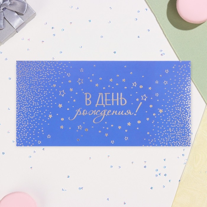 Конверт для денег "В День рождения!" синий, тиснение, 17 х 8 см