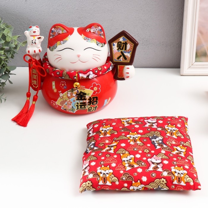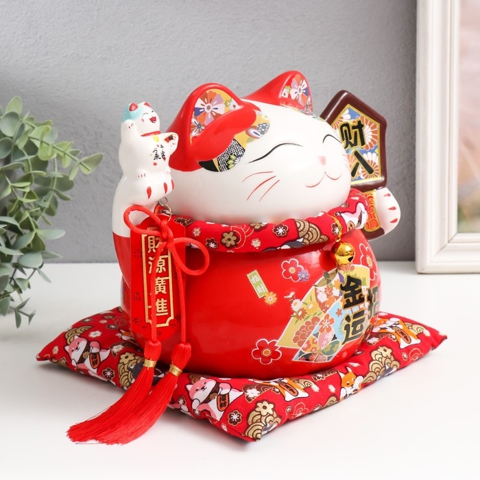 Копилка керамика "Кот Манэки-нэко с табличками богатства" красный 15х24х20 см