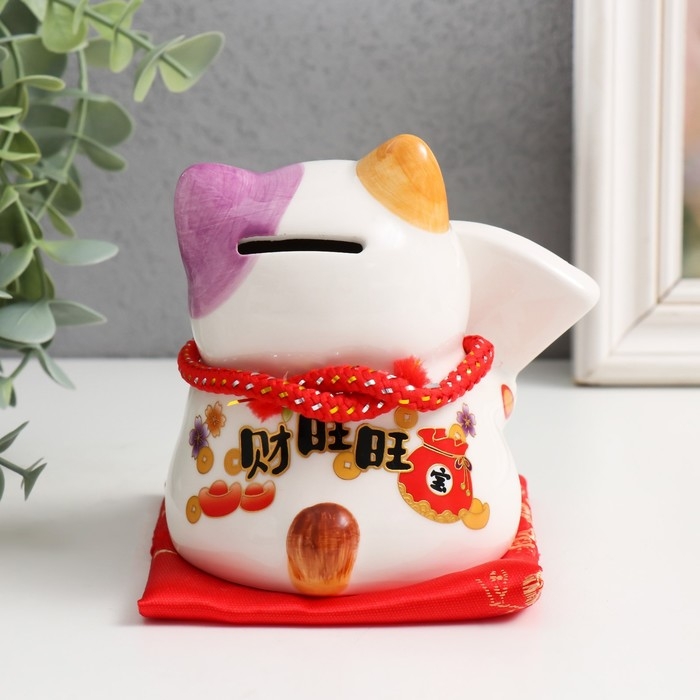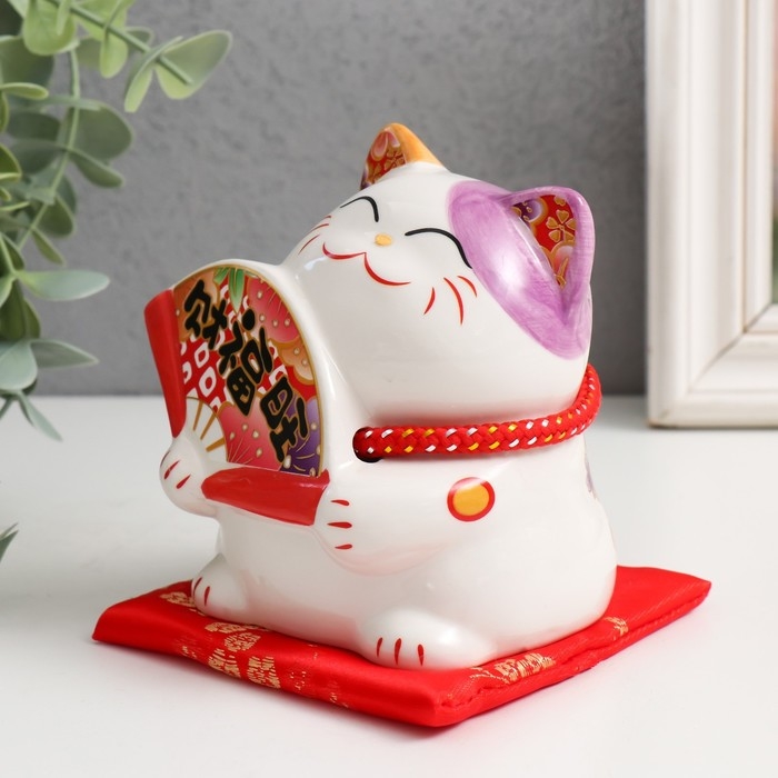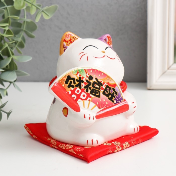 Копилка керамика "Кот Манэки-нэко с веером для привлечения богатства и удачи" 9х9,5х9,5 см