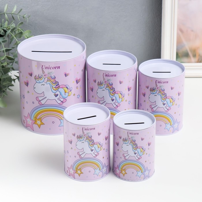 Копилка металл банка"Единорог на радуге" н-р 5 шт 7,5х10,5;8,5х11,5;9х12,5;10х14;13,5х16 см
