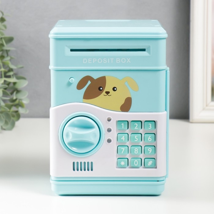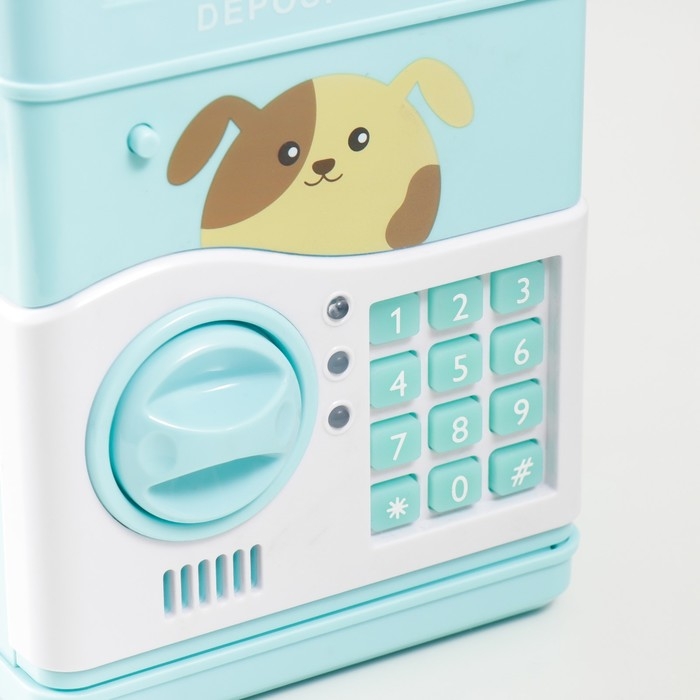 Копилка пластик "Сейф. Щенок" кодовый замок, звук АА голубой 13х12х19 см