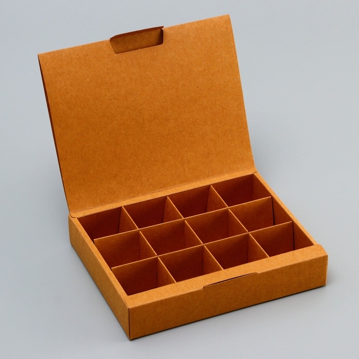 - Внутри предусмотрено разделение на 12 ячеек, что позволяет аккуратно разместить каждую конфету, предотвращая их смещение во время транспортировки.