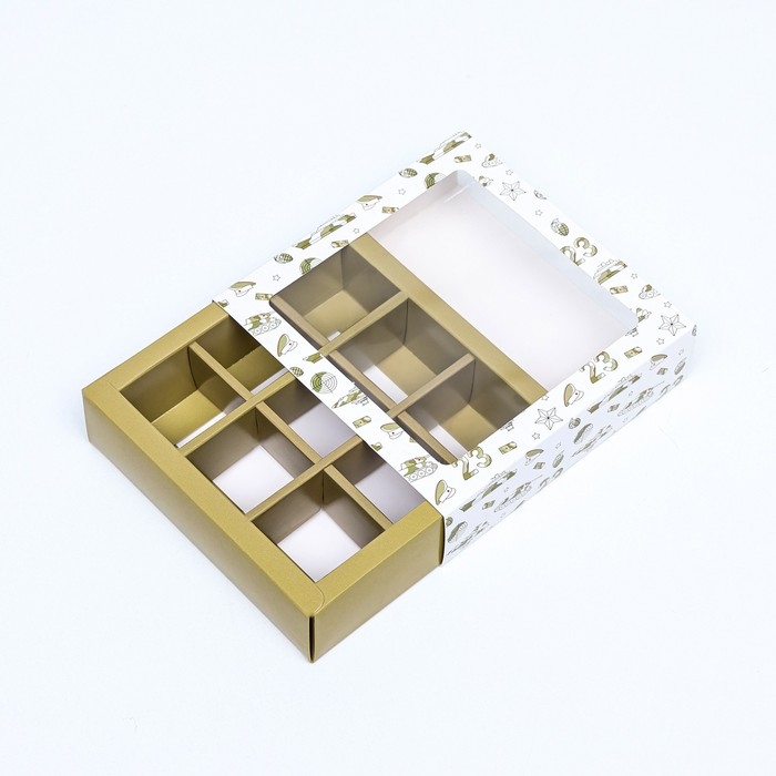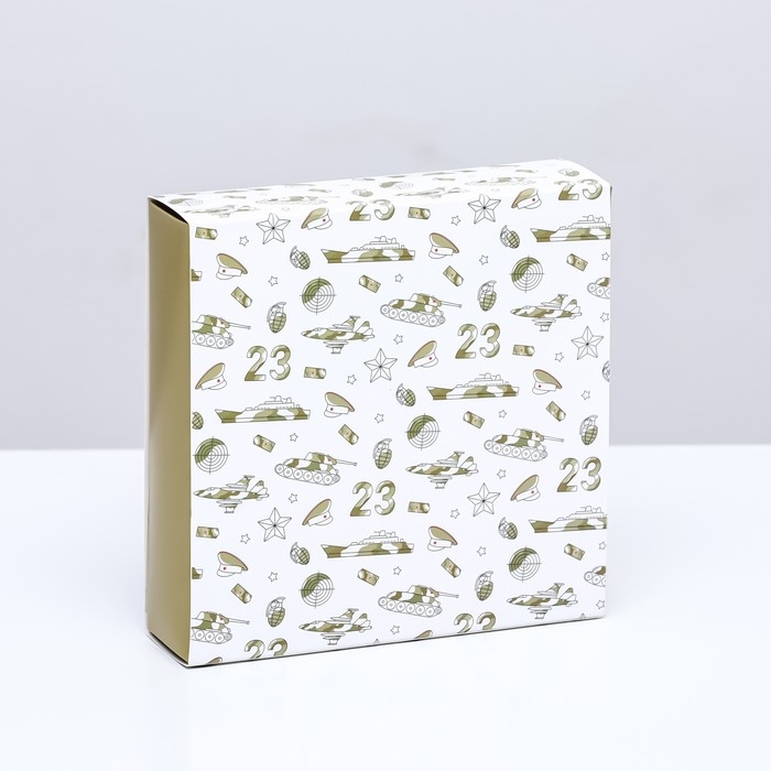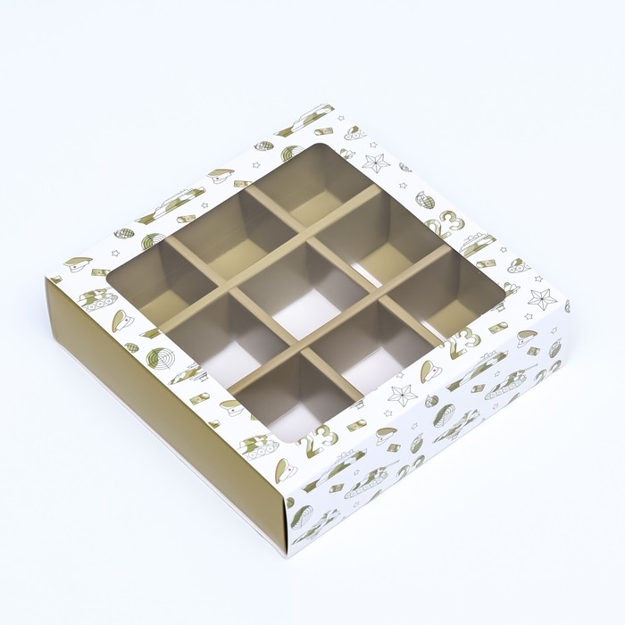 Коробка для 9 конфет с обечайкой , "23 Февраля" 13,8 х 13,8 х 3,8. Кондитерская упаковка