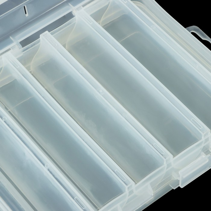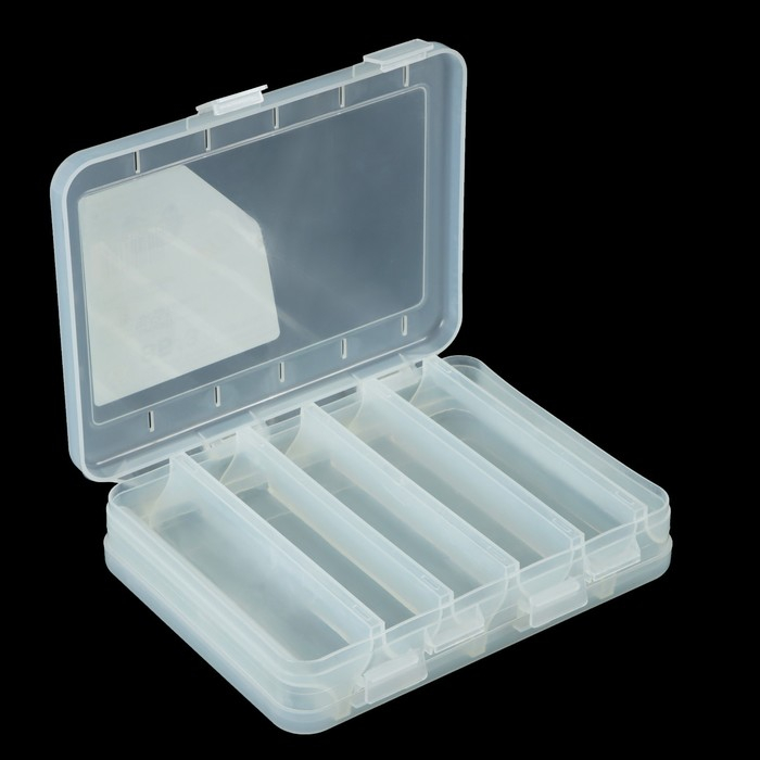 Коробка изготовлена из высококачественного пластика, двусторонняя, по 5 отсеков с обеих сторон. Может использоваться не только для хранения воблеров, но и балансиров, транспортировки блесен. На крышке бокса предусмотрены отверстия для вентиляции, которые избавляют от излишней влаги и снижают риск появления ржавчины металлических частей рыболовных принадлежностей.