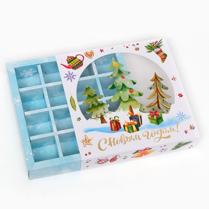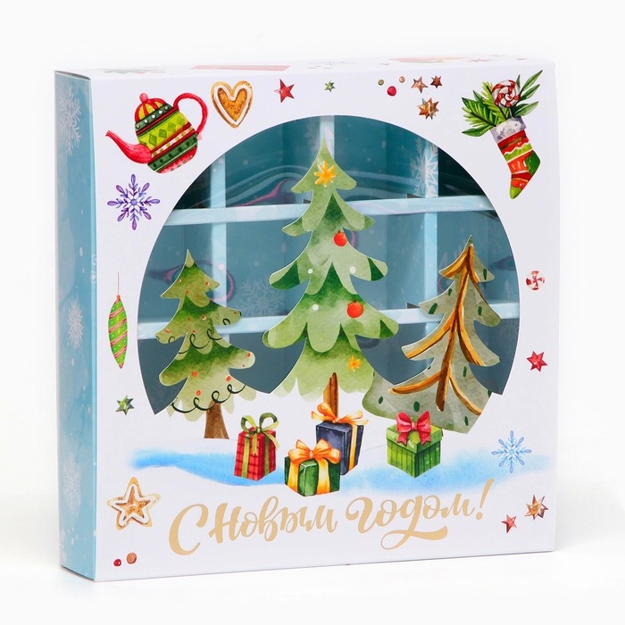 Коробка с обечайкой, с окном, под 16 конфет, "Елочки", 17,7 х 17,7 х 3,8 см
