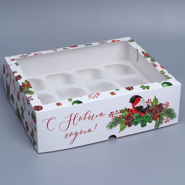 Коробка складная на 12 капкейков с окном «Снегирь», 32,8 х 25,6 х 10 см, Новый год