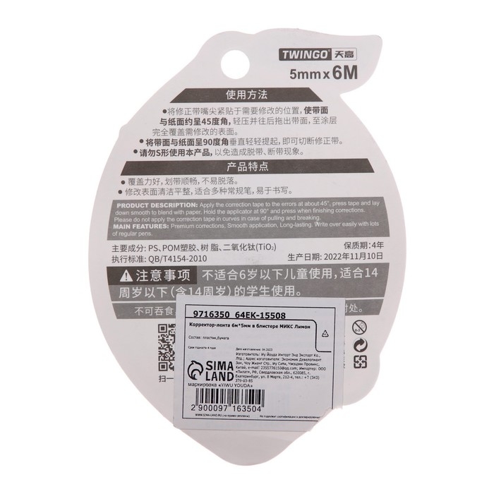 Корректор-лента 6м х 5мм "Лимон", в блистере, МИКС