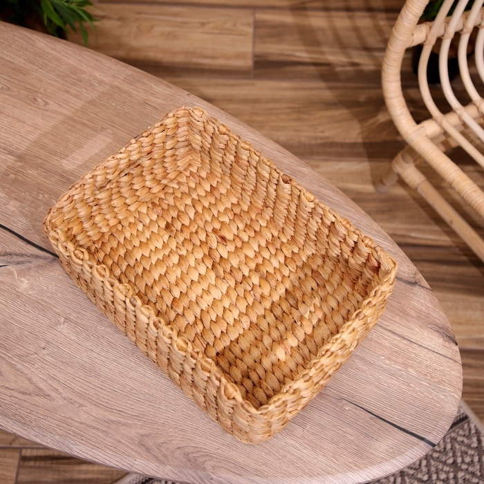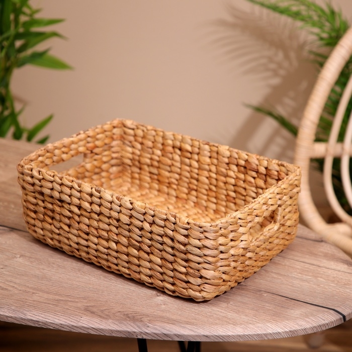 Плетёная корзинка ручной работы сделана из водного гиацинта. Поверхность обработана водоотталкивающим и антибактериальным покрытием, поэтому изделия можно использовать в ванных комнатах.