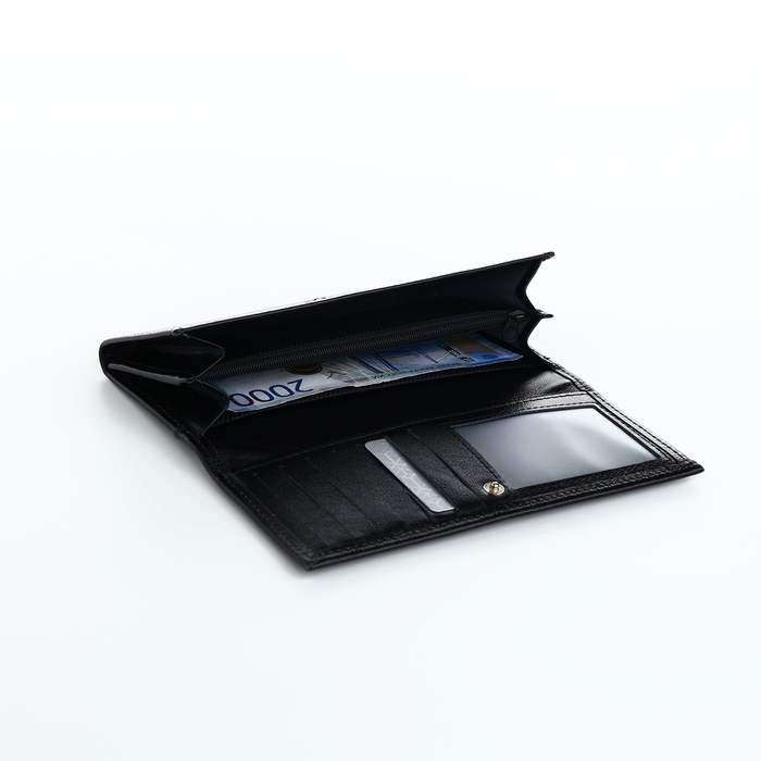 Два отделения позволяют удобно размещать как купюры, так и карты, а специальные отделы на молнии, расположенные снаружи и внутри, обеспечивают надёжное хранение монет и мелочей.