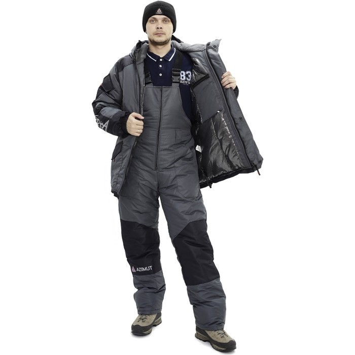 Костюм мужской зимний утеплённый, подходит также для регионов с экстремальными температурами ниже -45С, состоит из полукомбинезона и куртки. Выполнен из ветро и влагонепроницаемой мембранной ткани.