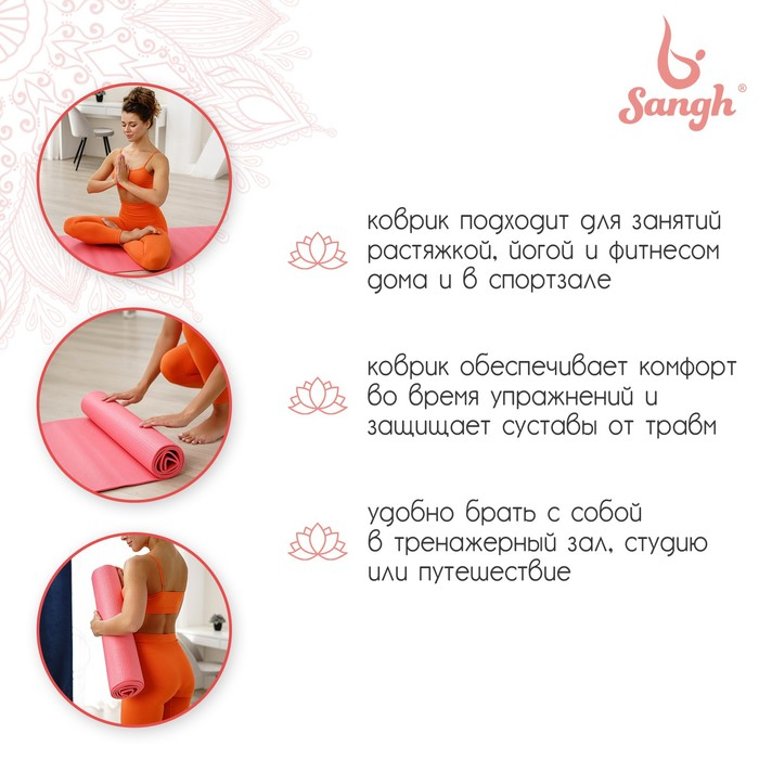 Коврик для йоги Sangh, 173×61×0,5 см, цвет розовый