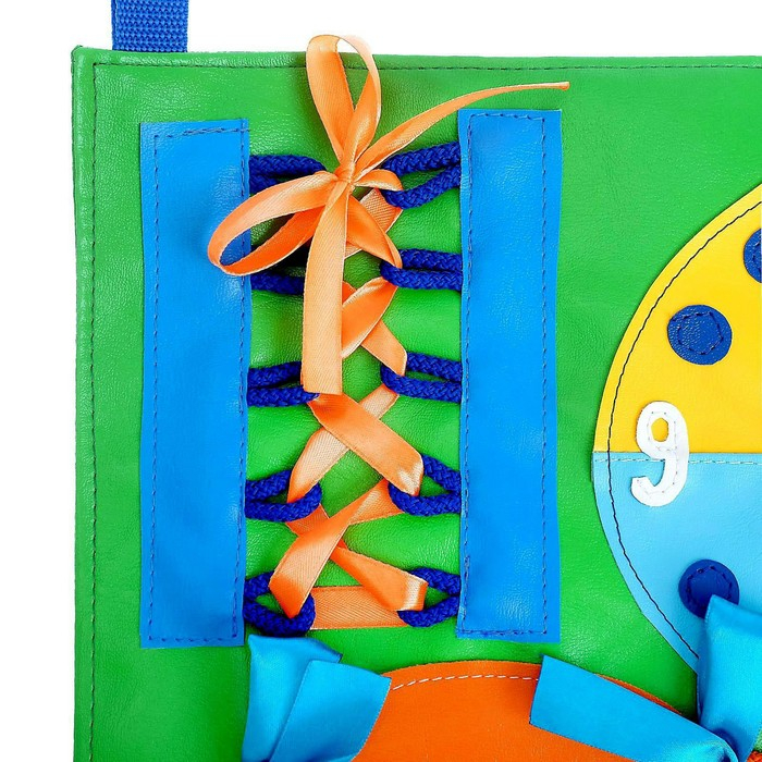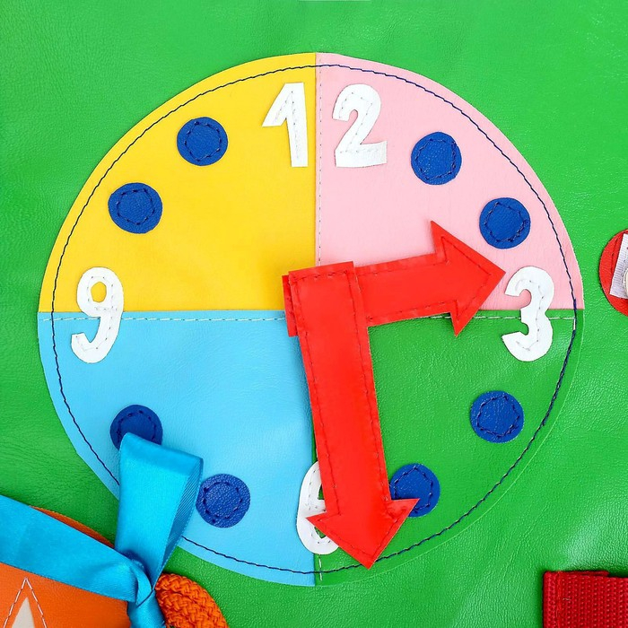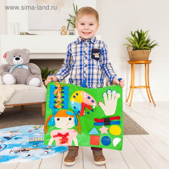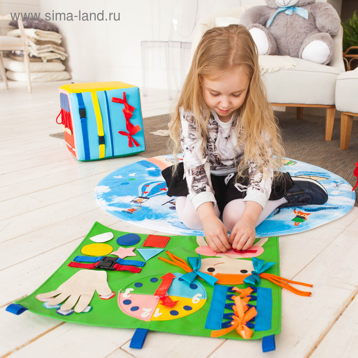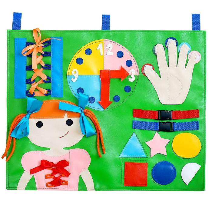 В процессе игры ребёнок научится определять время по часам, шнуровать, завязывать банты, плести косички и застёгивать замки.