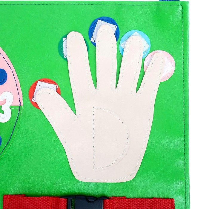 Коврик можно повесить за лямки либо играть за столом или на полу. Изделие выполнено из винилискожи. Материал легко очищается от загрязнений, достаточно лишь протереть влажной губкой, смоченной в мыльном растворе.