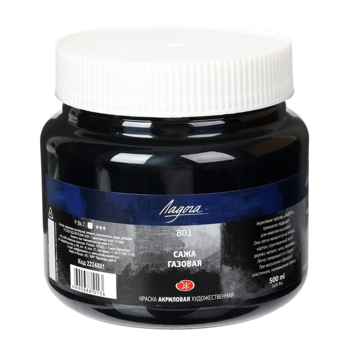 Краска акриловая художественная 500 мл, ЗХК "Ладога", сажа газовая, 2224801