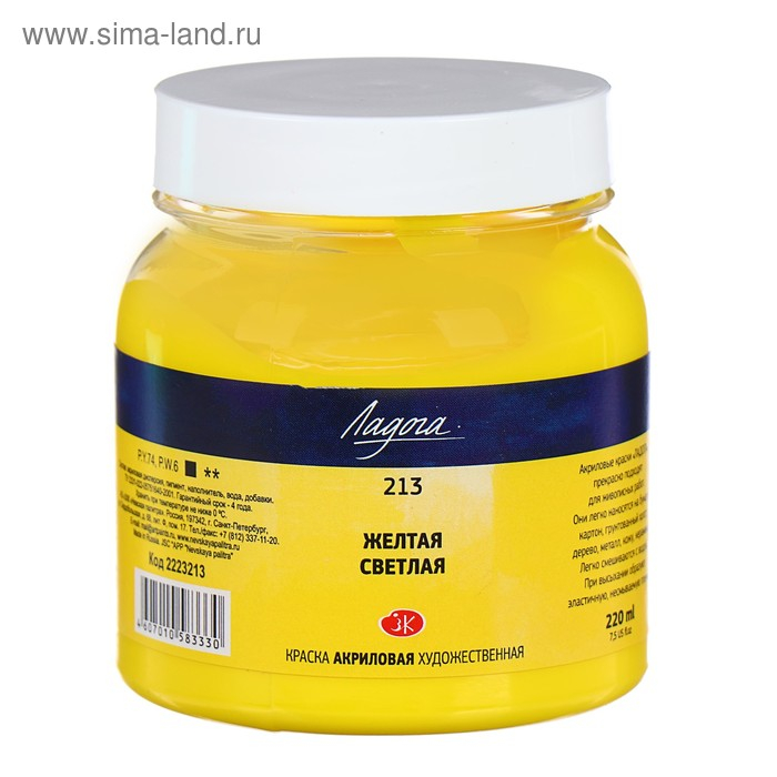 Краска акриловая художественная в банке 220 мл, ЗХК "Ладога", жёлтая светлая, 2223213