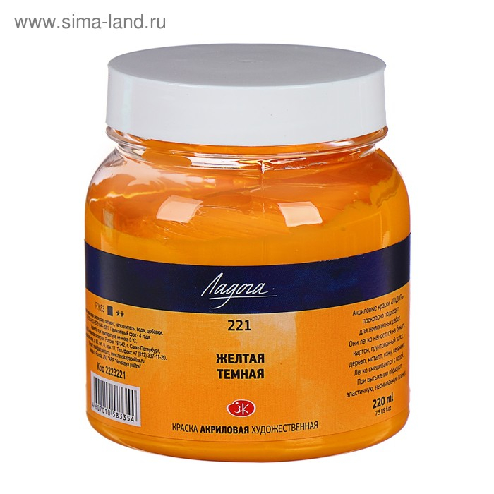 Краска акриловая художественная в банке 220 мл, ЗХК "Ладога", жёлтая тёмная, 2223221