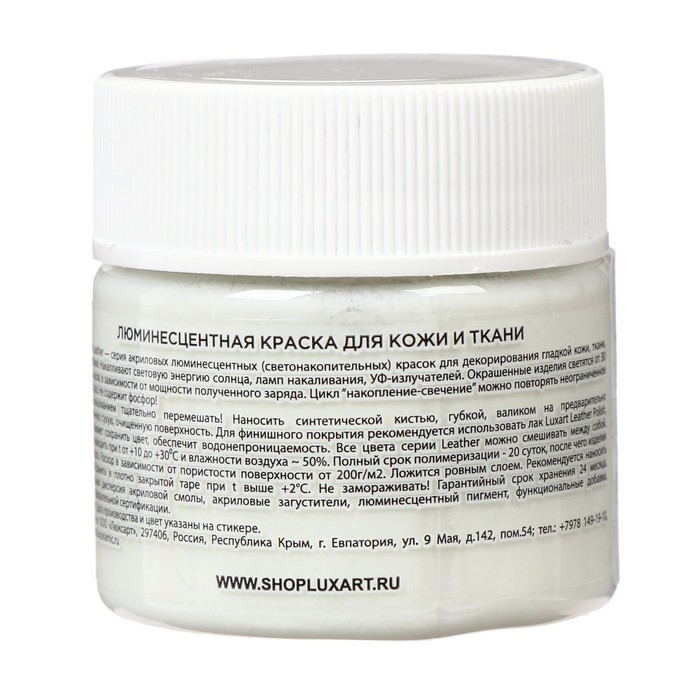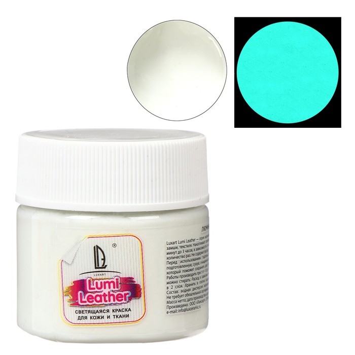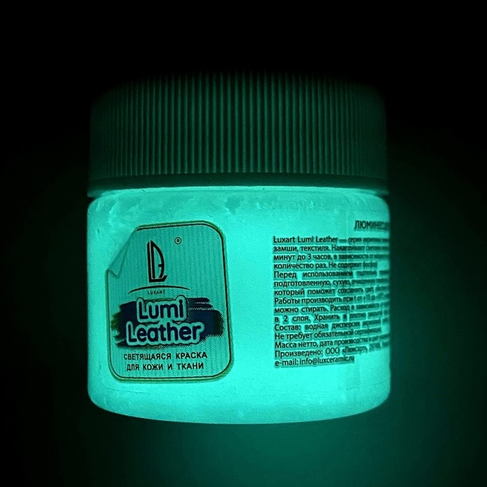 Универсальная краска-краситель на водной основе Luxart Leather Lumi , для всех видов гладкой кожи, замши, нубука, текстиля. Применяется для восстановления или декорирования кожаных/тканевых изделий. Глубоко проникает в структуру кожи и ткани, может быть использована в качестве грунта перед покраской. Все цвета смешиваются между собой для получения других цветов или оттенков. Чтобы получить нужный цвет используйте базовые цвета серии Luxart Leather и Luxart Leather Base. Cветонакопительные краски светятся в темноте без использования дополнительных УФ-излучателей. Обладают свойством накапливания световой энергии от солнца и электрических ламп, а в темном помещении излучают её (светятся). Цикл “накопление-свечение” можно повторять неограниченное количество раз. После накопления энергии краски и окрашенные ими изделия светятся в темноте от 30 минут до 3 часов, в зависимости от мощности полученного заряда. Краски серии Luxart Leather Lumi НЕ СОДЕРЖАТ ФОСФОР!