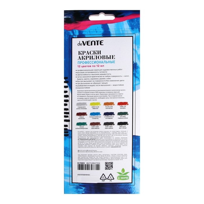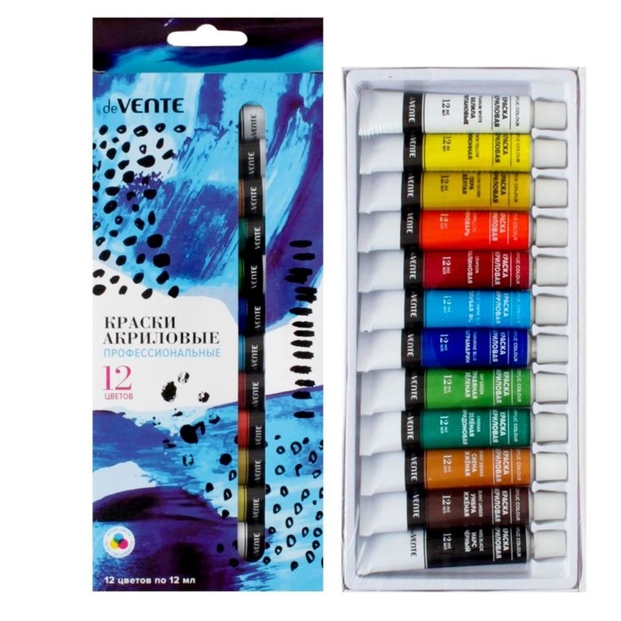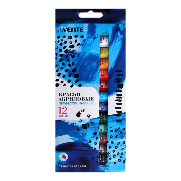 Краски акриловые профессиональные художественные "deVENTE" 12 цветов по 12 мл, в алюминиевых тубах, в картонной коробке с окном и блистерным подвесом.