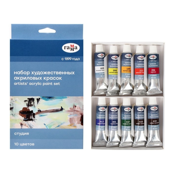 Краска акриловая в тубе, набор 10 цветов х 18 мл, Гамма "Студия", морозостойкая, в картонной коробке, 181020214