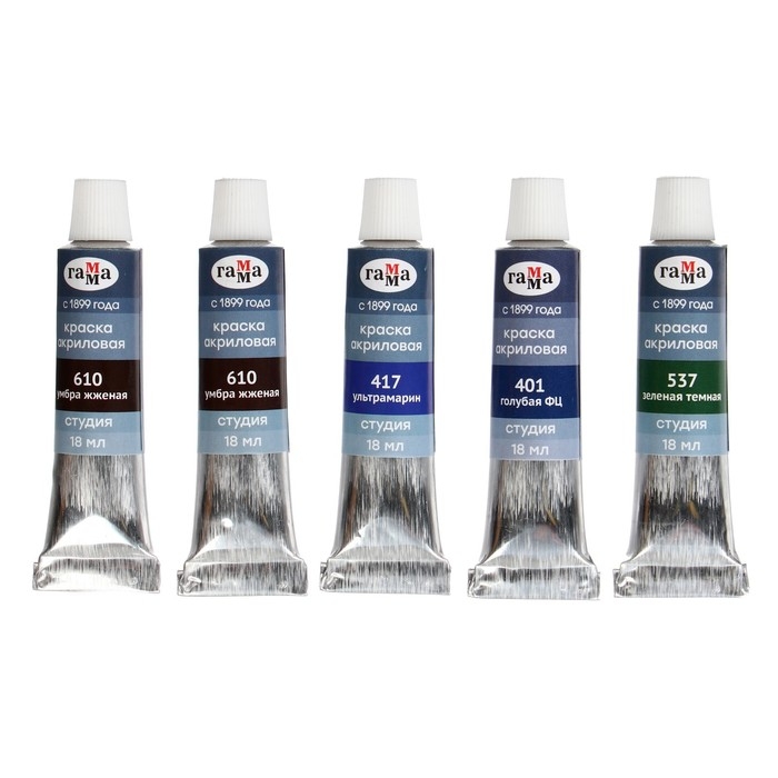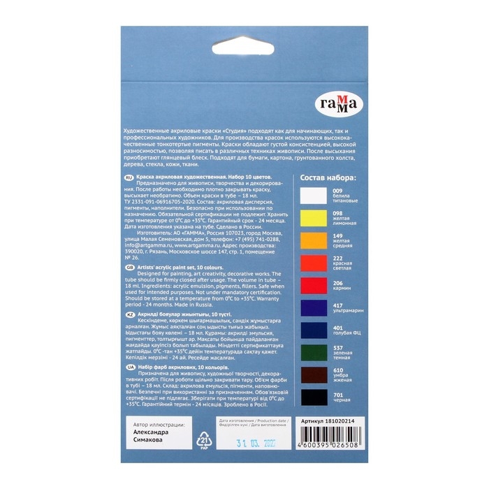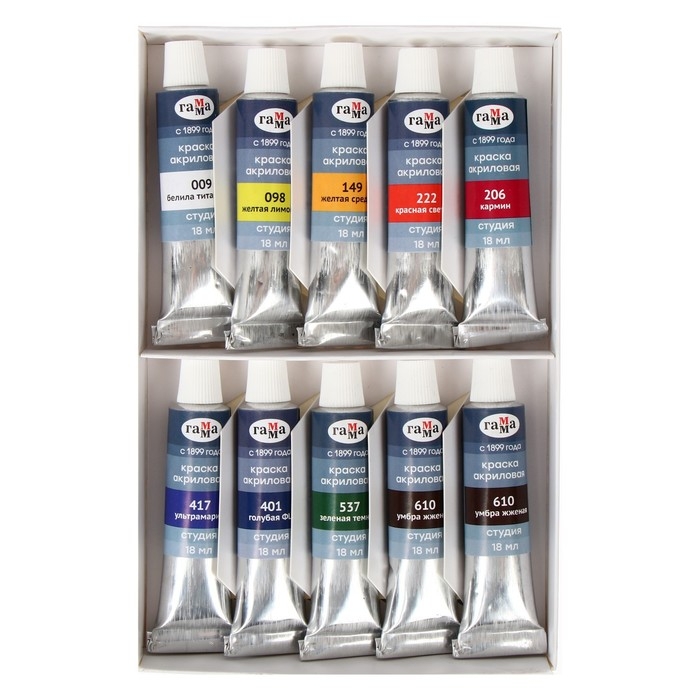 Набор новых акриловых красок "ГАММА" серии "Студия" предназначен для художественно-живописных и декоративно-прикладных работ. Главные отличия: насыщенные цвета, высокая адгезия, прочность красочного слоя. В упаковке 10 цветов. Объём тубы − 18 мл. После высыхания краски становятся глянцевыми, практически не темнеют, специальная добавка позволяет максимально раскрыть красоту цветов. Художественный акрил прекрасно разносится, подходит для бумаги, картона, грунтованного холста, дерева, стекла, кожи, ткани. Время высыхания: от 10 минут до 1 часа в зависимости от толщины слоя.