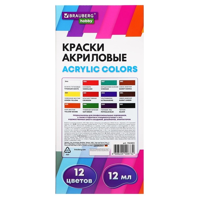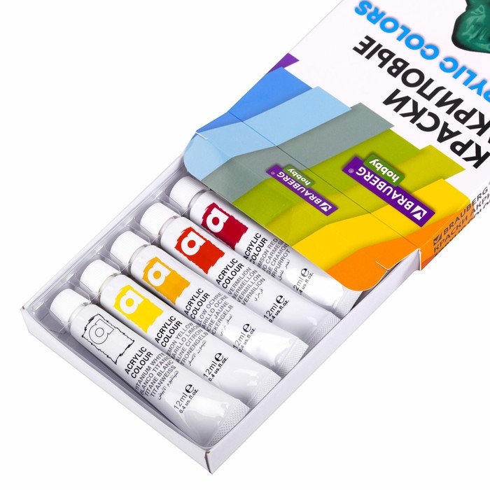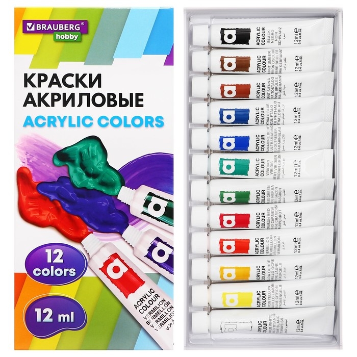 Краска акриловая в тубе, набор 12 цветов х 12 мл, BRAUBERG HOBBY, 192403