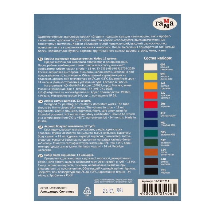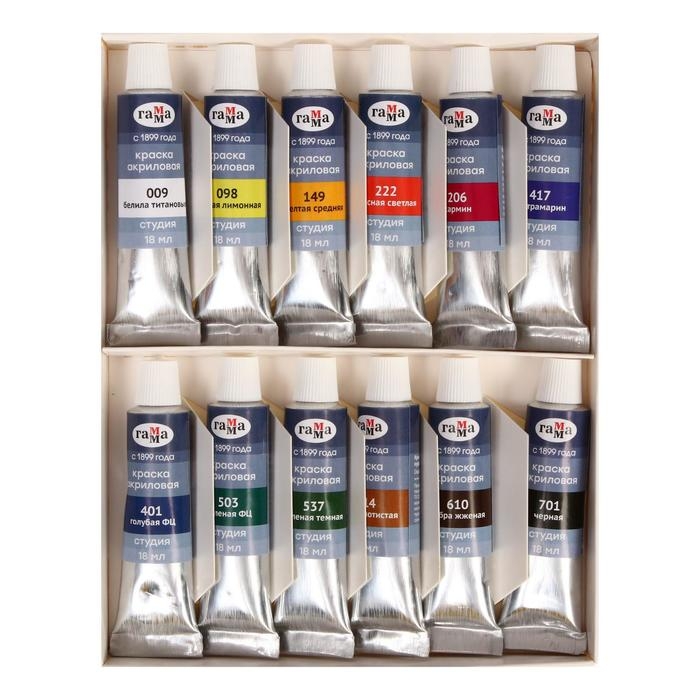Краска акриловая в тубе, набор 12 цветов х 18 мл, Гамма "Студия", морозостойкая, в картонной коробке, 160320211