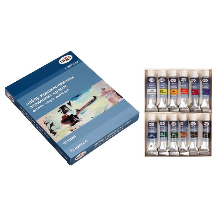 Набор акриловых красок ГАММА серии "Студия" состоит из 12 шт в тубах, объёмом 18 мл. Краски предназначены для художественно-живописных и декоративно-прикладных работ.Главные отличия: насыщенные цвета, высокая адгезия, прочность красочного слоя. После высыхания краски становятся глянцевыми, практически не темнеют, специальная добавка позволяет максимально раскрыть красоту цветов. Художественный акрил прекрасно разносится, подходит для бумаги, картона, грунтованного холста, дерева, стекла, кожи, ткани. Время высыхания от 10 минут до 1 часа, в зависимости от толщины слоя.Набор выпускается в картонной коробке.