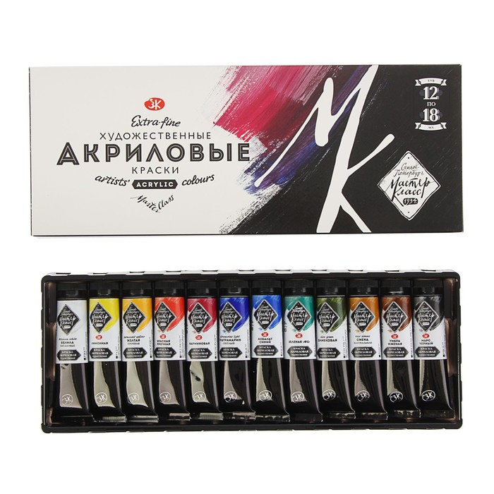 Краска акриловая в тубе, набор 12 цветов х 18 мл, ЗХК "Мастер-класс", профессиональная серия, 12341417