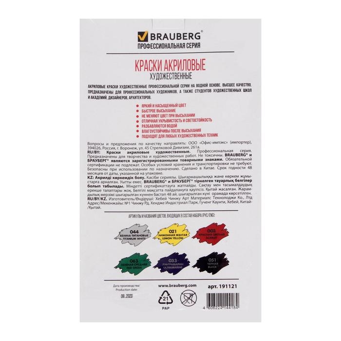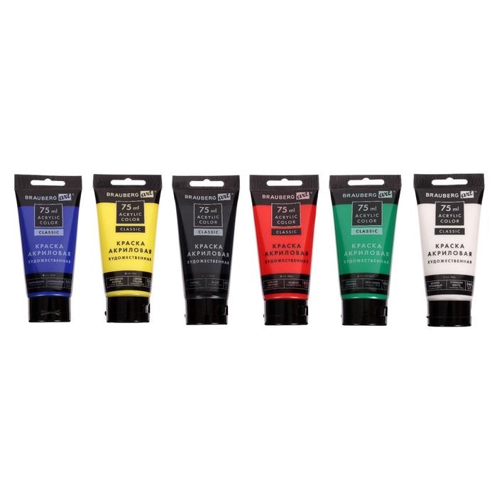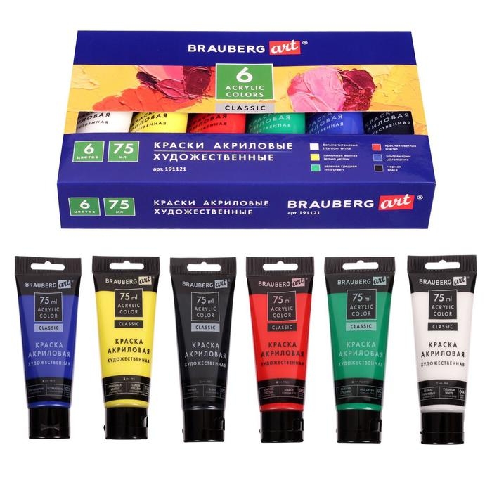 Краска акриловая в тубе, набор 6 цветов х 75 мл, BRAUBERG ART CLASSIC, профессиональная серия, 191121