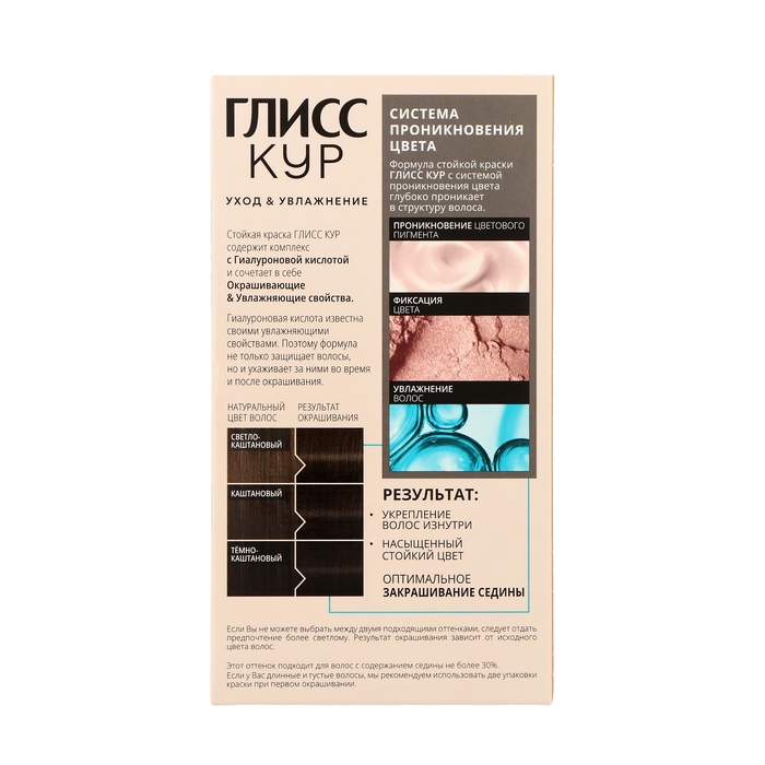 Формула c системой Color Care Delivery глубоко проникает в структуру волоса. Cтойкая краска Gliss Kur c гиалуроновой кислотой, известной своими увлажняющими свойствами, не только защищает волосы, но и ухаживает за ними во время и после окрашивания.