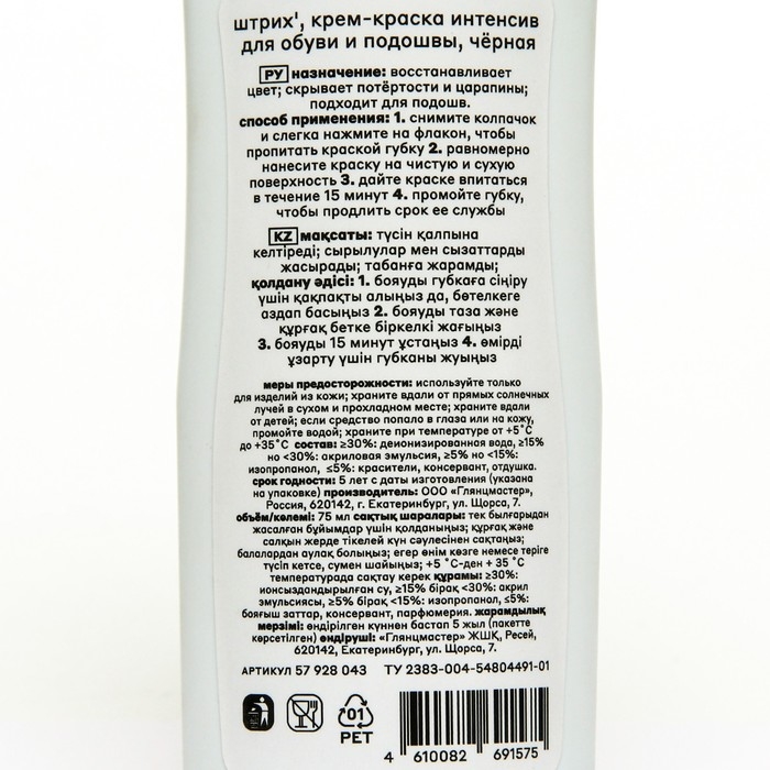 Назначение: восстанавливает цвет, скрывает потёртости и царапины, подходит для кроссовок и для подошв.