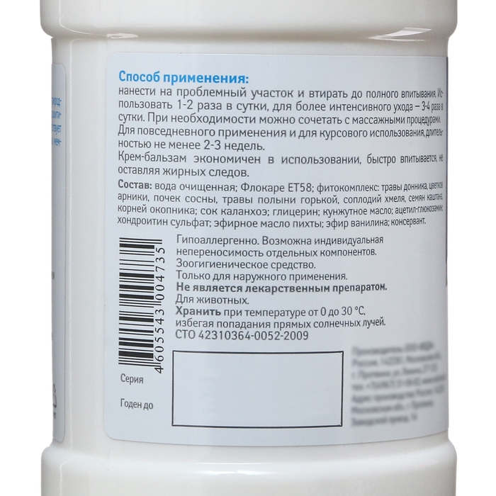 Эффективность крем-бальзама обусловлена композицией природных компонентов, усиленной сочетанием глюкозамина и хондроитина. Биологически активный комплекс крем-бальзама способствует активизации микроциркуляции, восстановлению клеточных мембран, оптимальному питанию и защите тканей.