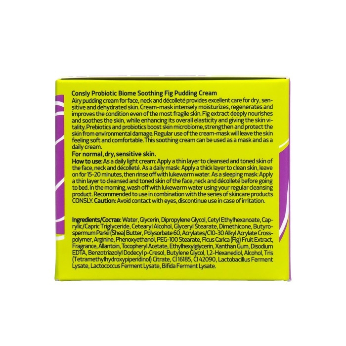 Успокаивающий крем с экстрактом инжира Consly Probiotic Biome Soothing Fig Pudding Cream имеет следующий состав: Water, Glycerin, Dipropylene Glycol, Cetyl Ethylhexanoate, Caprylic/Capric Triglyceride, Cetearyl Alcohol, Glyceryl Stearate, Dimethicone, Butyrospermum Parkii (Shea) Butter, Polysorbate 60, Acrylates/C10-30 Alkyl Acrylate Crosspolymer, Arginine, Phenoxyethanol, PEG-100 Stearate, Ficus Carica (Fig) Fruit Extract, Fragrance, Allantoin, Tocopheryl Acetate, Ethylhexylglycerin, Xanthan Gum, Disodium EDTA, Benzotriazolyl Dodecyl p-Cresol, Butylene Glycol, 1,2-Hexanediol, Alcohol, Tris (Tetramethylhydroxypiperidinol) Citrate, Cl 16185, CI 42090.