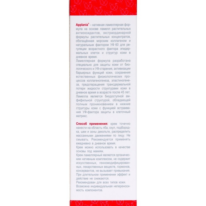 Крем для лица ламеллярный дневной Applania подходит для всех типов кожи и может использоваться ежедневно. Он помогает увлажнить и смягчить кожу, улучшить ее текстуру и тон, а также создать защитный барьер от негативных внешних воздействий.