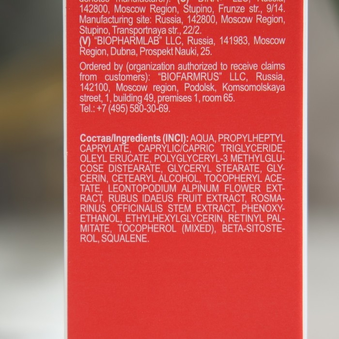 Состав: aqua, propylheptyl caprylate, caprylic/ capric triglyceride, oleyl erucate, polyglyceryl-3 methylglucose distearate, glyceryl stearate, glycerin, cеtearyl alcohol, tocopheryl acetate, leontopodium alpinum extract, rubus idaeus fruit extract, rosmarinus officinalis (rosemary) leaf extract, phenoxyethanol, ethylhexylglycerin, retinyl palmitate, tocopherol (mixed), betasitosterol.