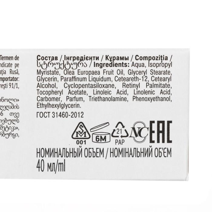 Состав: Aqua, Isopropyl Myristate, Olea Europaea (Olive) Oil, Glyceryl Stearate , Glycerin, Paraffinum Liquidum , Ceteareth-12 , Cetearyl Аlcohol, Cyclopentasiloxane, Retinyl Palmitate, Tocopheryl Acetate, Linoleic Acid, Linolenic Acid, Carbomer, Parfum, Тriethanolamine, Phenoxyethanol, Ethylhexylglycerin.