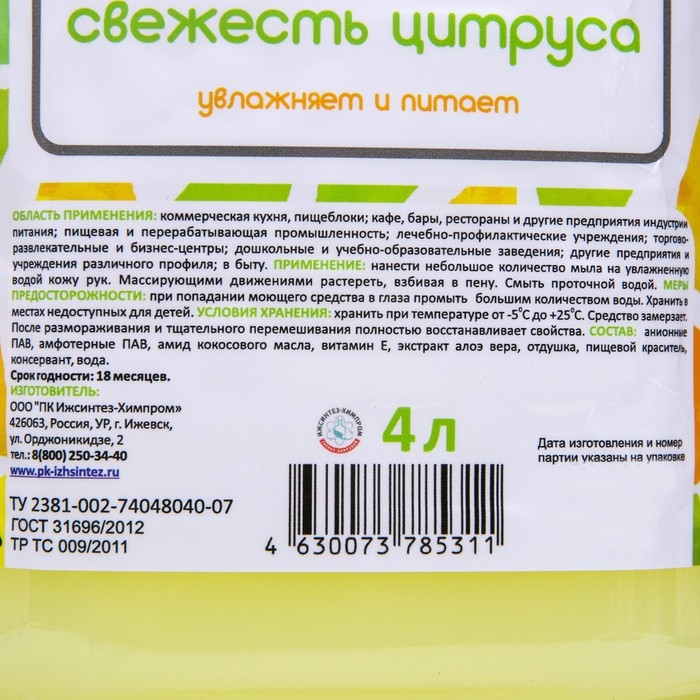 Состав: анионные ПАВ, амфотерные ПАВ, амид окосового масла, витамин Е, экстракт алоэ вера, отдушка, пищевой краситель, консервант, вода.
