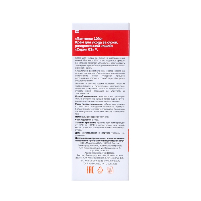 Крем Пантенол 10% серии 03 — это надёжное средство для ухода за сухой и раздражённой кожей. Он содержит 10% активного вещества — пантенола, который интенсивно увлажняет кожу, ускоряет регенерацию клеток и способствует быстрому восстановлению.