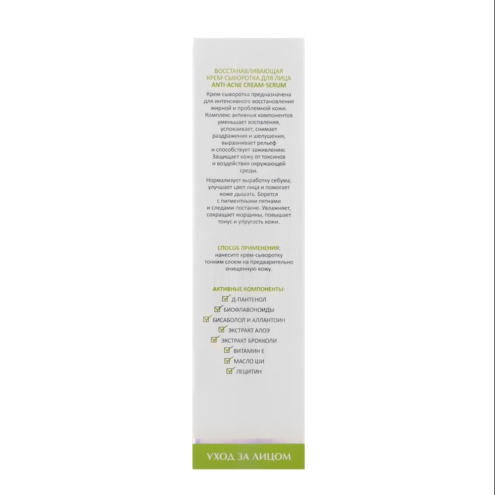 Крем-сыворотка предназначена для интенсивного восстановления жирной и проблемной кожи. Комплекс активных компонентов уменьшает воспаления, успокаивает, снимает раздражения и шелушения, выравнивает рельеф и способствует заживлению. Защищает кожу от токсинов и воздействия окружающей среды. Нормализует выработку себума, улучшает цвет лица и помогает коже дышать. Борется с пигментными пятнами и следами постакне. Увлажняет, сокращает морщины, повышает тонус и упругость кожи.