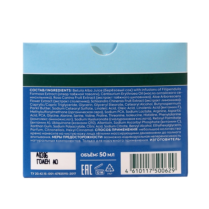 Состав: Betula Alba Juice (берзовый coк) with infusions of Filipendula, Formosa Extract (отвар таёжной таволги). Centaurium Erythraea Oil (масло алтайского семисильника). Rosa Canina Fruit Extract (экстракт таёжного шиповника). Aloe Arborescens, Flower Extract (экстракт столетника), Schisandra Chinensis Fruit Extract (экстракт лимонника): Caprylic/Capric Triglyceride, Glycerin, GlycervI Stearate, Cetearyl Alcohol, Butyrospermum Parkii Butter, Sodium Ceteorvi Sulfate, Linoleic Acid. Oleic Acid, Linolenic Acid (витамин F). Methylsulfonyimethone (органическая серо), Sodium PCA, Sodium Lactate, Argirine, Aspartic ACid, PCA: Glycine, Alonine, Proline, Threonine, Isoleucine. Histidine, Prenyidionine (комплекс аминокислот), Sodium Hyaluronate (гиалуроновая кислота). Retinyi Palmitote (витамин A), Ubiquinone (коэнзим ©10), Allantoin, Sodium Ascorbyl Phosphate (витамин ©). Xanthan Gum. Sodium Polyacr note, Citric Acid, Sodium Citrate, Benzyi Alcohol, Ethyihexylgiycerin. Parfum, Citronellols, Hexvi Cinnamal.