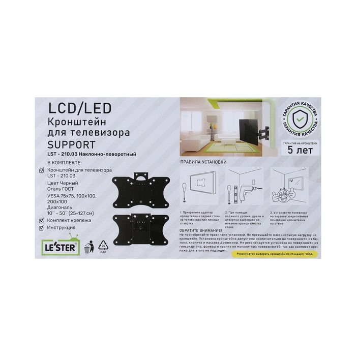 Кронштейн LE'STER LST-210.03, для ТВ,наклонно-поворотный, 10-50",60-110 мм от стены,черный
